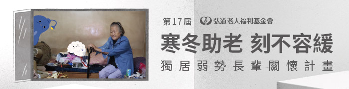 在很多看不見的地方,埋藏著弱勢獨老的無聲盼望,邀請您支持「寒冬助老,刻不容緩」獨居弱勢長輩關懷計畫,讓弘道幫您傳遞溫暖到社會角落,透過長期穩定的關懷服務,發現與陪伴更多角落孤老人,讓獨老不孤單。