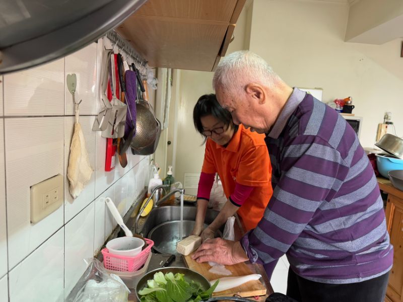 為了讓丁爺爺重拾「總舖師」的風采與重溫家裡圍爐的熱鬧景況,弘道在春節前夕策劃了溫馨小圍爐,帶來豐盛的美味年菜,爺爺親自下廚料理拿手菜「白菜火鍋」和「九層塔炒蛤蠣」,豪邁的說:「過年圍爐就是要吃熱騰騰的好料!」當天一早,志工與社工陪同丁爺爺前往他熟悉的菜市場採買食材。在廚房裡,爺爺從容清理料理,從刀法、調味到熬湯,動作行雲流水,讓在場的志工和社工們都讚嘆爺爺寶刀未老!