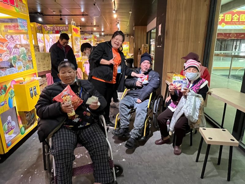 出發當天,沿途風景明媚,據點的長輩們一邊欣賞窗外宜人的景色、一邊談天,滿懷期待地朝著目的地前進。阿祝阿嬤雖然多以輪椅代步,卻仍堅持要自己走路,在知名的觀光工廠內,阿嬤開心地四處試吃,最後選購辣的豆乾和牛肉乾,還參與特別設計的刮刮樂遊戲,臉上始終掛著燦爛笑容。
